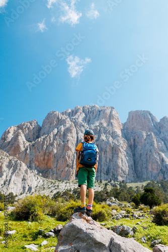 © zhukovvvlad, Obraz premium boy with a backpack on a hike against the backdrop of the mountains. child traveler with backpack, hiking, travel, mountains in the background, kids summer vacation.