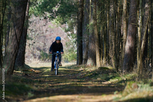 Fototapeta premium Boy with blue helmet rides a bicycle in forest