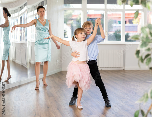 © JackF, Naklejka premium Boy with girl during contemporary vigorous dancing lesson. Children rehearse rumba movement. Female teacher conducts class for students during dance workout