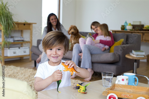 © dglimages, Fototapeta premium Boy with Toy Dinosaurs