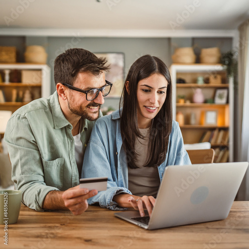 © Miljan Živković, Fototapeta premium Boyfriend and girlfriend buy online on laptop with credit card at home