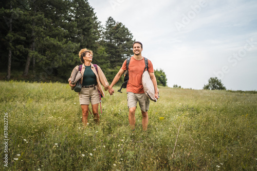 © Miljan Živković, Fototapeta premium Boyfriend and girlfriend walk around forest with camp equipment