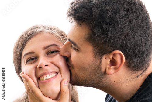 Fototapeta premium Boyfriend kissing cute girlfriend cheek as couple concept