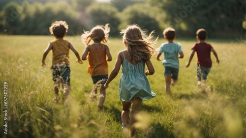© DavidArt, Obraz premium boys and children run in the meadow at sunset happy and in company. Friendship and fun. Freedom among boys and young people, long live life, enjoy life. New opportunities. New beginning. AI generative