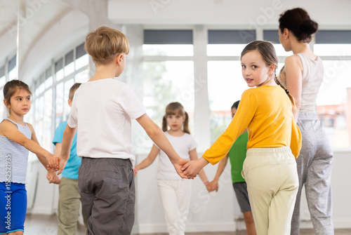 Fototapeta premium Boys and girls holding hands perform incendiary traditional roundelay folk dance during rehearsal in studio.