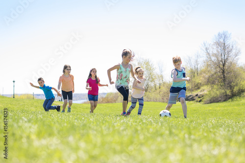 © Louis-Paul Photo, Fototapeta premium Boys and girls running towards football