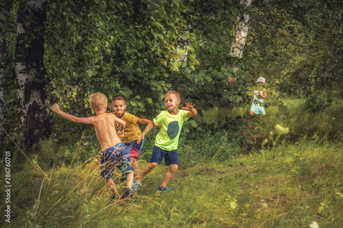 © splendens, Obraz premium Boys fighting over girls outdoors in forest countryside childhood lifestyle