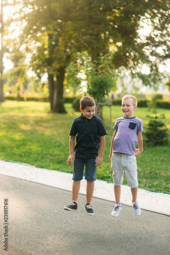 © Aleksandr, Fototapeta premium Boys have activity. Children run around and jumt up in the air