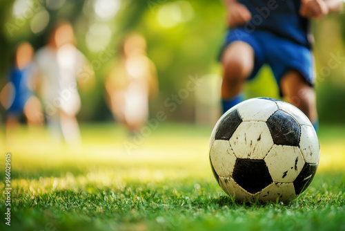 Fototapeta premium Boys playing soccer outdoors, running towards soccer ball on grassy field. Football training for children. Concept of sports and teamwork.