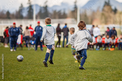 © sunnybright, Fototapeta premium Boys playing soccer with spectators in the background