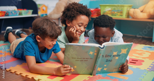 © peopleimages.com, Fototapeta premium Boys, reading and friends on carpet, school and learning with education, relax and bonding together. Group, storytelling and children in classroom, literacy knowledge and happiness with break