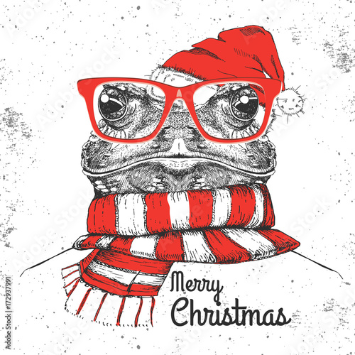 Naklejka premium Boże Narodzenie Hipster moda zwierzęca żaba ubrana w noworoczny kapelusz i...