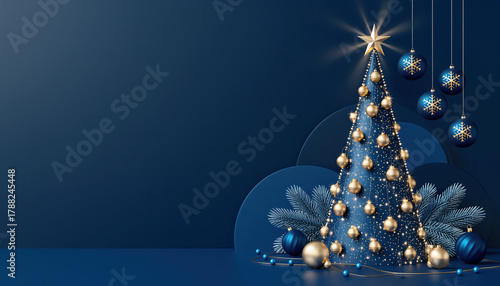 Naklejka premium Bożonarodzeniowe, niebiesko-złote tło z choinką i bombkami oraz miejscem na...