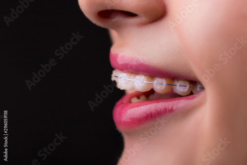 © Dmitry, Obraz premium Braces. Beautiful Woman healthy smile close up. Closeup Ceramic Braces on Teeth. Beautiful Female Smile with Braces. Orthodontic Treatment.