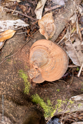© David Al, Fototapeta premium Bracket Fungus Growing on Tree Trunk in Forest Floor