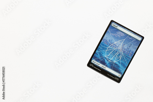 Obraz premium Bradford, UK Nov 3 2025 Basic Land Island card from the Spider-man magic the gathering card game shot isolated on a white paper background.
