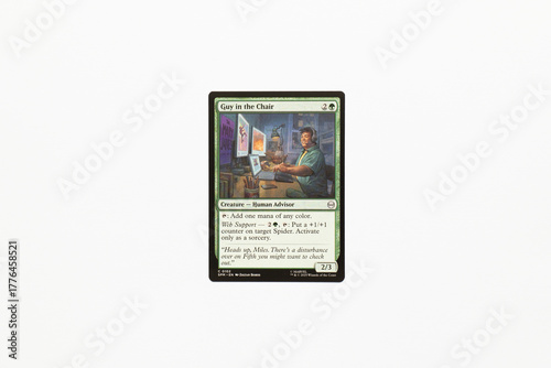 © Bennphoto, Obraz premium Bradford, UK Nov 3 2025 Guy in the Chair card from Spider-man magic the gathering card game shot isolated on a white paper background.