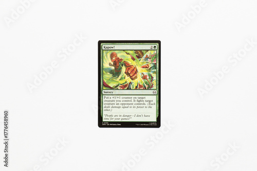 © Bennphoto, Naklejka premium Bradford, UK Nov 3 2025 Kapow! card from Spider-man magic the gathering card game shot isolated on a white paper background.
