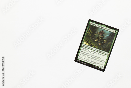 © Bennphoto, Naklejka premium Bradford, UK Nov 3 2025 Prowler Misguided Mentor card from Spider-man magic the gathering shot isolated on a white paper background.