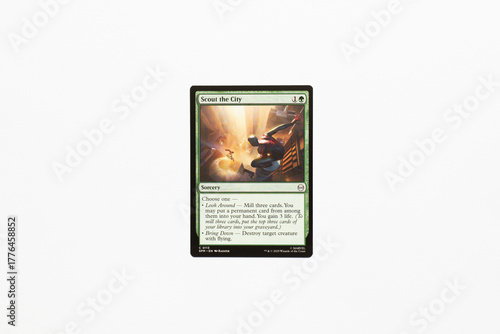 © Bennphoto, Naklejka premium Bradford, UK Nov 3 2025 Scout the City card from Spider-man magic the gathering card game shot isolated on a white paper background.