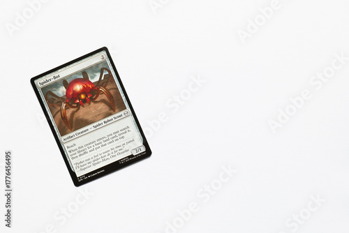 © Bennphoto, Obraz premium Bradford, UK Nov 3 2025 Spider-Bot Artifact Creature card from the Spider-man magic the gathering card game shot isolated on a white paper background.