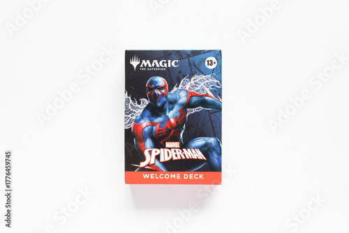 © Bennphoto, Naklejka premium Bradford, UK Nov 3 2025 Spider-man magic the gathering card game welcome pack shot isolated on a white paper background.