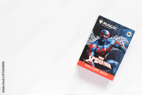 © Bennphoto, Naklejka premium Bradford, UK Nov 3 2025 Spider-man magic the gathering card game welcome pack shot isolated on a white paper background.