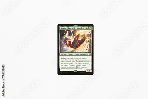 © Bennphoto, Naklejka premium Bradford, UK Nov 3 2025 Spider-man, Miles Morales card from the Spider-man magic the gathering card game shot isolated on a white paper background.