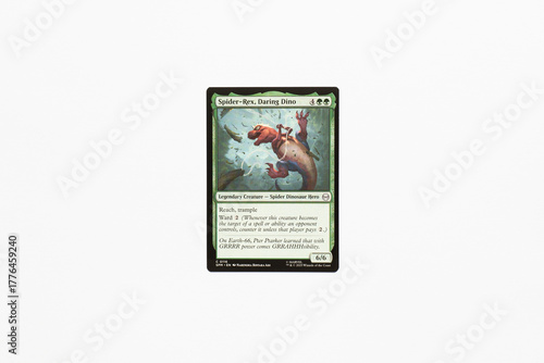 © Bennphoto, Naklejka premium Bradford, UK Nov 3 2025 Spider-Rex, Daring Dino card from Spider-man magic the gathering shot isolated on a white paper background.