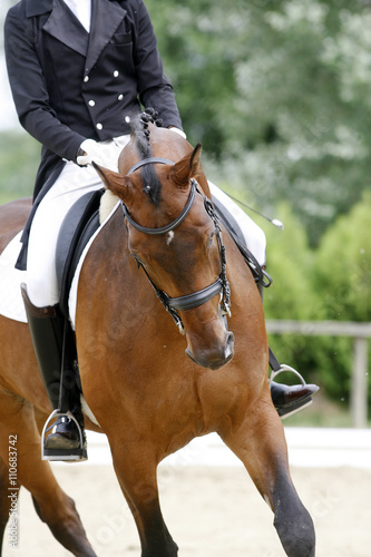 © acceptfoto, Obraz premium Braided mane for dressage sport horse during a dressage training