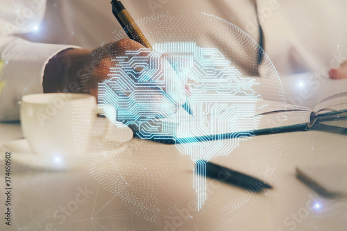 Fototapeta premium Brain multi exposure icon with man hands background.