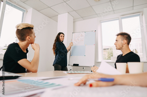 Fototapeta premium brainstorming, generating ideas, discussing and concentration. goals visualization. designers team at meeting at studio