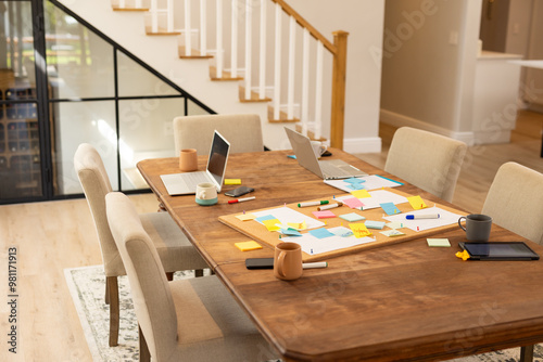 © wavebreak3, Fototapeta premium Brainstorming ideas, laptops and sticky notes on table in modern home office