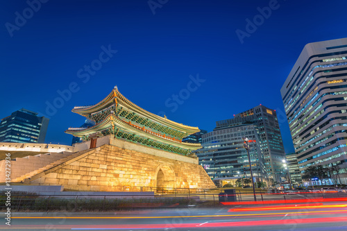 Obraz premium Brama Namdaemun i panoramę miasta Seul w nocy, Seul, Korea Południowa