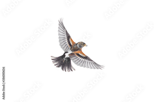 Fototapeta premium Brambling bird in flight isolated on white background.
