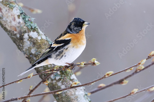 © Henri, Obraz premium Brambling (Fringilla montifringilla) male in snowfall perched on a branch in spring.
