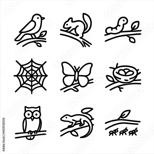 Fototapeta premium Branch Animal Icons. Outline icon set of branch animals: bird on branch, squirrel climbing, caterpillar on branch, spider web,