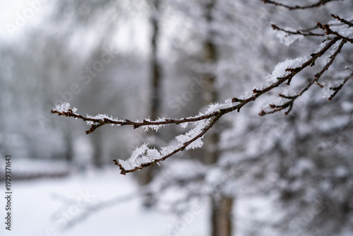 Obraz premium Branch covered with snow crystals.