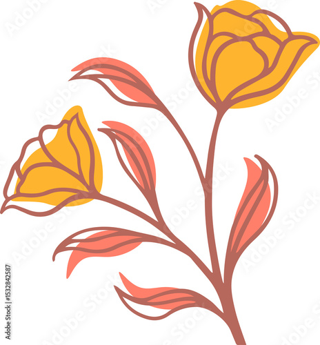 © vectorfusionart, Naklejka premium Branch is showcasing two yellow tulips and coral leaves in flat design on transparent background