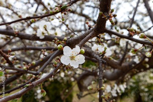 © studiographicmh, Obraz premium Branch of a blossoming tree with beautiful white flowers
