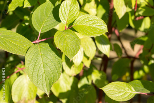 © wasnoch, Obraz premium Branch of Cornus Alba. Green natural summer background.