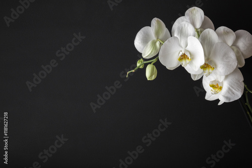 © fotoduets, Obraz premium Branch of fresh white orchid flowers on dark black background. Closeup. Condolence card. Empty place for emotional, sentimental text, quote or sayings. Front view.