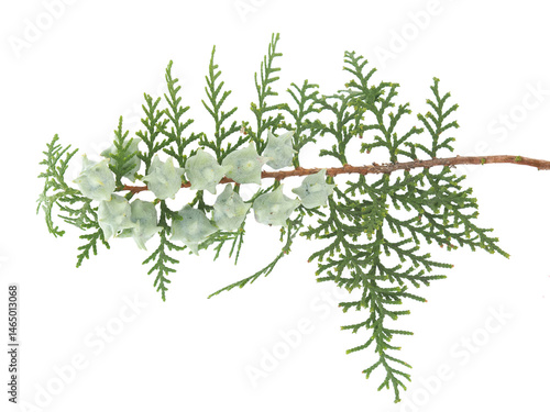 © emilio100, Obraz premium Branch of Oriental thuja tree isolated on white, Platycladus orientalis
