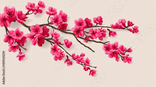 Naklejka premium Branch Of Vibrant Pink Cherry Blossoms On A Soft Beige Background Symbolizing Spring And Renewal