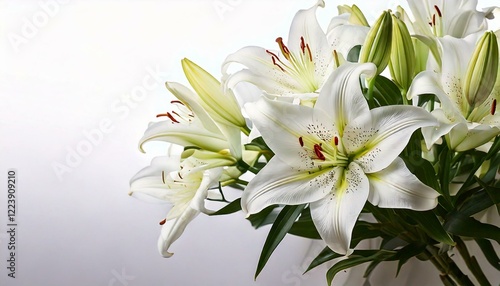 © MdRakibul, Fototapeta premium Branch of white lilies flowers. Mourning or funeral white background