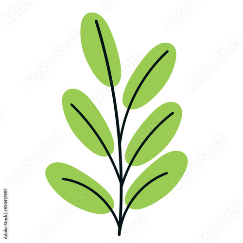 Naklejka premium Branch with green leaves, one branch with green bright leaves in doodle...
