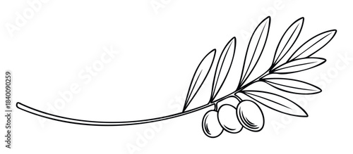 Fototapeta premium Branch with olives and leaves in a minimalist line drawing for food and wellness branding and organic product promotion.