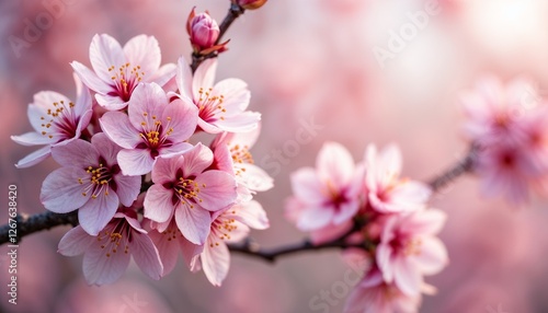 Obraz premium Branch with pink flowers on a light background, macro photography style