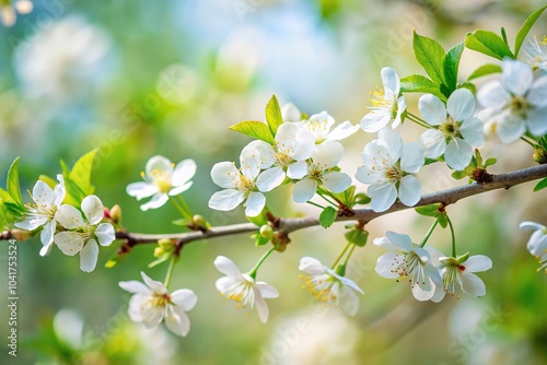 Obraz premium Branch with white flowers and green leaves at a tilted angle