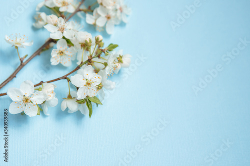 Obraz premium Branch with white flowers on a blue background, space for text. Spring...